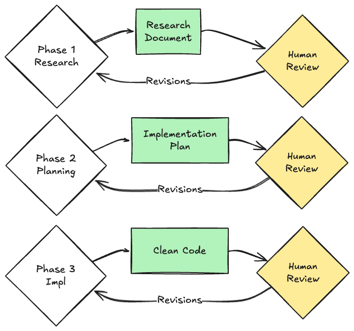 The first phase treats the AI as a research assistant focused solely on understanding the problem space. Given a high-level goal, the AI explores the codebase to identify all relevant components. The output is a research document that maps the terrain we'll be working in.