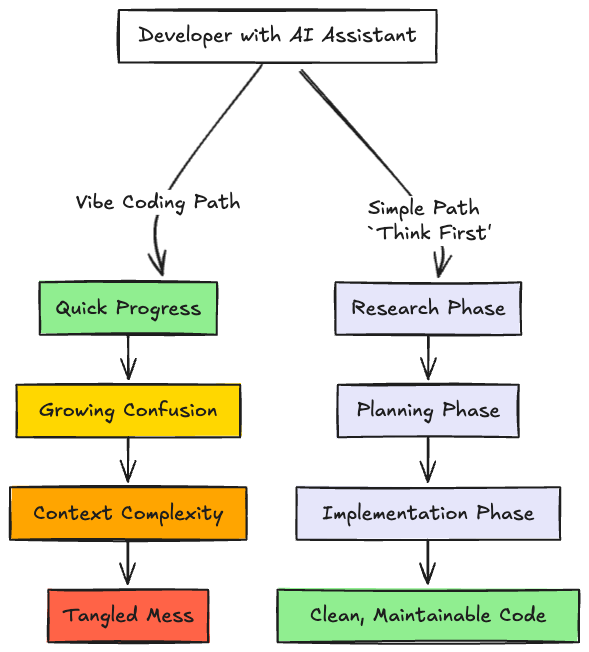 This final phase becomes pleasingly straightforward. Because we've already done the hard work of thinking and planning ahead of time, the AI can focus on translating the plan into code. The context remains clean and focused, preventing the accumulation of complexity that inevitably strangles long conversational sessions.