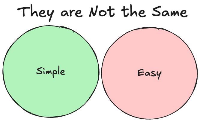 Hickey makes a distinction between simple and easy that at first sounds pedantic. Simple meaning: a single braid, one responsibility, or one concept that doesn't touch anything else. Easy, meaning the thing you reach for automatically. The familiar choice. The solution you can implement without a design doc. The easy approach seduces you because it asks nothing of you in return for using it. The definition of simple really has no overlap with easy, but it is a common idea that simple things are easy, which is not always the case.